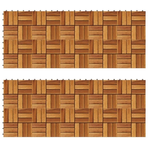 Dette sæt med 30 terrassefliser i hårdttræ vil være perfekt til at pynte op på overflader og gangstier i din have, på terrassen eller altanen, eller i hvilket som helst andet rum. Mønstret er ikke blot dekorativt, men er også nemt at stå fast på. Terrassefliserne er lavet af akacietræ af høj kvalitet, et tropisk hårdttræ, som naturligvis er vejrbestandigt og meget holdbart. På grund af at de passer ind i hinanden, kan man nemt få fliserne til at hænge godt sammen, så de giver et stabilt område, man kan gå på. Pakken inkluderer 30 terrassefliser i træ.Vi har en overraskelse til dig! Brug rabatkoden dbaXL, når du betaler, og så får du 10% ekstra rabat. Denne rabatkode kan kun bruges til vidaXL-mærkede produkter, og den kan anvendes med et minimum købsbeløb på 750kr. God shoppingtur!