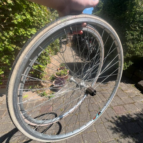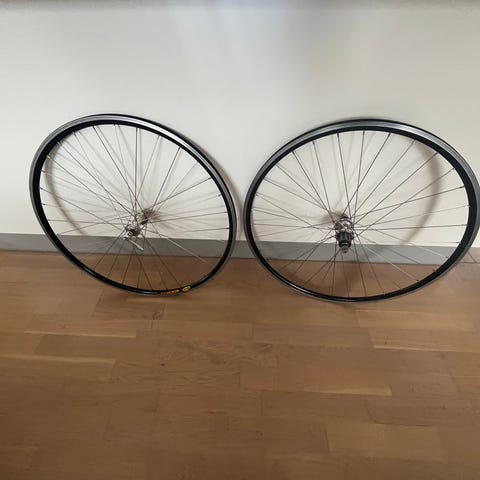 Alderen taget betragtning er det et pænt hjulsæt med flot anodiserede fælge med få brugsspor - primært på bremsefladerne.