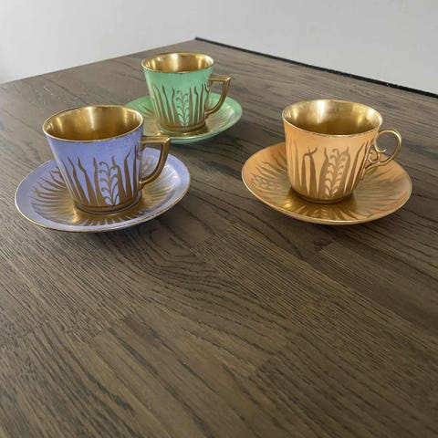 7 flotte store retro mokka kopper fra Royal Copenhagen. Kongeligt dansk design. No. 069. Tre med grøn kant, tre med lyserød kant og en med guld kant. Af designeren Minas Bebe.