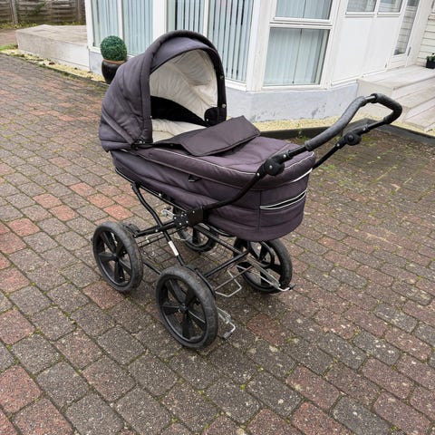 Har denne barnevogn, som er ca. 10 år gammel, den er brugt, har meget lidt rust, uden nogen betydning, dækken på barnevognen har en knap som er gået i stykker (se billedet) har gummi hjul