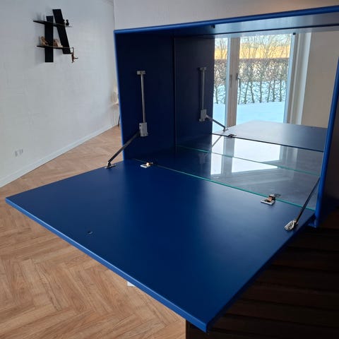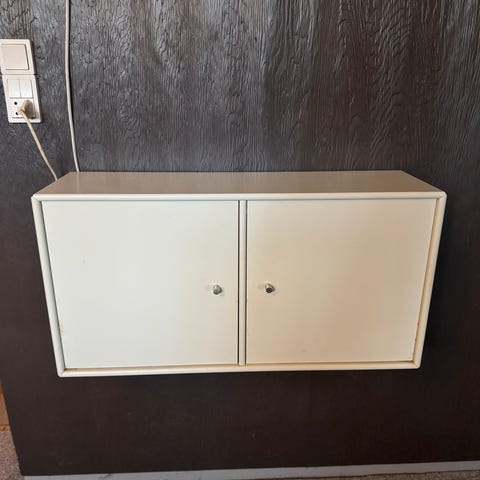 Montana skab i farven 01 white og låge i farven 04 anthracite, som er lavet til minibar med indbygget køleskab i mærket Dometic. Måler 70 cm i højde, 47 cm i bredde og 47 cm i dybde. Køleskabet virker perfekt og larmer ikke. Integreringen af køleskabet er lavet rigtig flot med udluftningshuller i bagbeklædningen lavet med hulsav. Flot stand med få brugsspor.