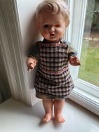 Dukker, Køge dukke, Gammel køgedukke i celluloid ca. 44 cm. Dukken er mærket i nakken og på ryggen med trekant logoet. Faste øjne - det ene øje ligger inde i hovedet. Hun har præget hår. Hun er ellers i meget fin stand. Hun har en lang bomuldskjole på. Hun har en gammel kjole og et gammelt forklæde på.