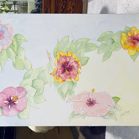 Smukt maleri på lærred som aldrig har været oppe at hænge. Det er originalt og unikt (der findes kun dette ene maleri), og har de smukkeste blege/pastel farver af blomster som hibiscus