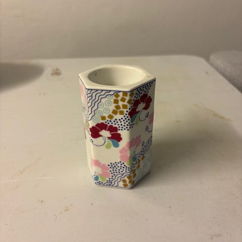 2 porcelænsstager til fyrfadslys fra Bing & Grøndahl i nuancen blå med guld. Japansk inspireret med blomstermønster. Den lille er solgt
