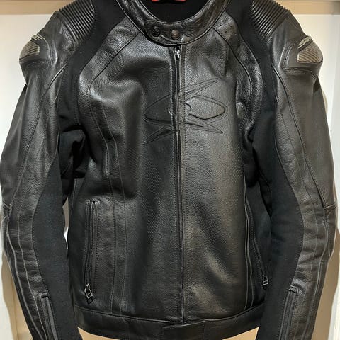 Meget pæn stand. Indre jakke kan tages af i varmt vejr. Størrelse 48 som er Small. Jeg er 170 cm men min bryskasse er blevet for stor, så en slank person kan godt passe den. Super kvalitet og dejlig blød læder.
