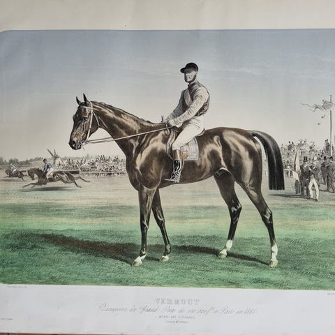 Maleri på print af 1980-ernes berømte og højt elskede engelske galophest “Desert Orchid”.