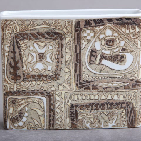 Unika vase i glaseret stentøj af Nils Thorsson for Den Kongelig Porcelænsfabrik. Glaseret med olivin-glasur (tror jeg nok) og udsmykket med organiske reliefdekorationer. Den har desværre haft en slåskamp med et støvsuger-rør og den tabte… og den valgte derfor at kaste sig selv udover reol-kanten. 😅