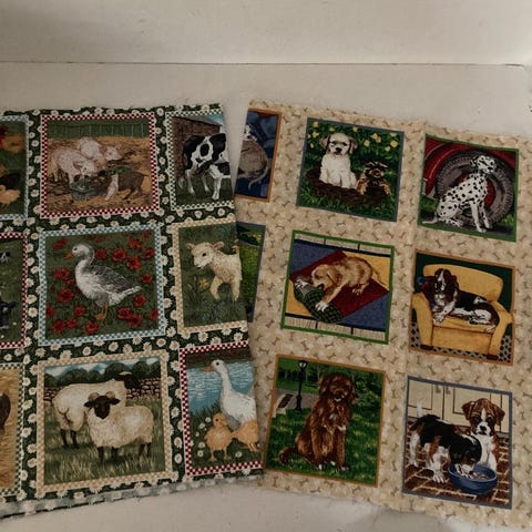 Høns i minimalistisk stil ( 92 x 11 cm) og et stykke med blomster og sommerfugle ( 57 x 38 cm). Bomuld. Ubrugte men har været opbevaret.