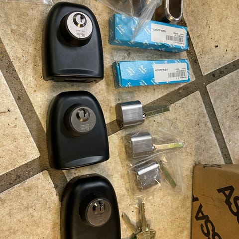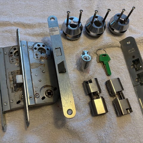 2 sæt dobbelte parvis enslukkende ovale låsecylindre (helt nye) med 2x3 nøgler. 2 sæt rosetter med lidt malingrester og 2 låselasser ASSA modular 8788. Sælges samlet og skal afhentes i Rågeleje.