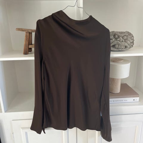 Bluse i 100% silke fra Schumacher, med skjult lynlåslukning (billede 2) og ekstra stykke, let fæstnet, til ryggen (billede 4). Med kort ærme, brystmål 112.