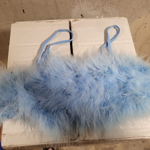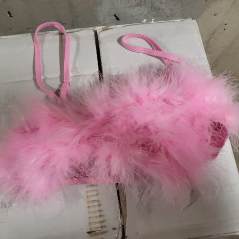 Lille top i lilla med fjer fra dolls kill sugar thrillz, str. S. Har den også til salg i lyserød, blå, sort og lilla. Alle i samme størrelse. Crop top