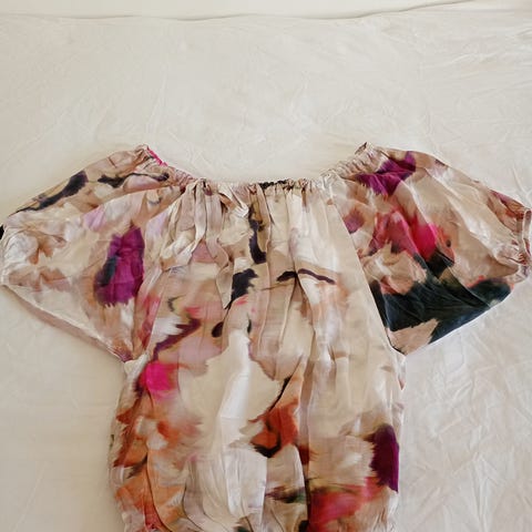 100% silke bluse i creme sand beige farvet. Fra InWear. Str. 38, den har trykknap ved ærmerne så de måde kan sætte op eller hænge ned, som vist på billederne.