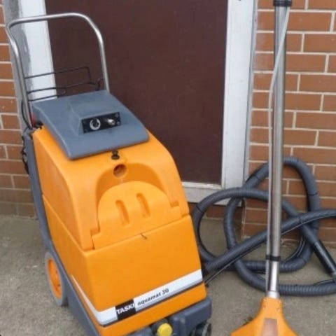 Taski Aquamat 10.1 tæpperenser i orange. Denne tæpperenser er designet til effektiv rengøring af tæpper og polstrede møbler. Den er udstyret med et kraftfuldt sugesystem og en stor vandtank, hvilket gør den ideel til både små og store rengøringsopgaver. Tæpperenseren er nem at betjene og har en robust konstruktion, der sikrer lang holdbarhed.