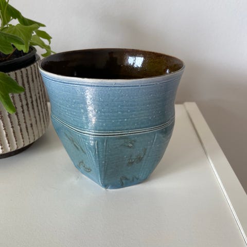 / potte / vase. Hvid, blå og lyseblå glasur. Lille afslag i glasuren nederst. Ellers i fin stand.