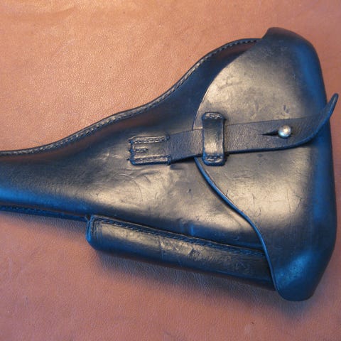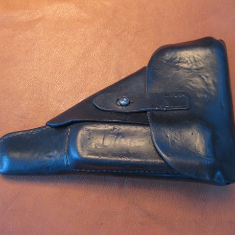 Superfint tysk hardshell Luger-hylster fra 1939. Det fremstår uden bæltestropper bagpå, da det har været brugt i Norge efter krigen. Nye stropper kan nemt sys på.
