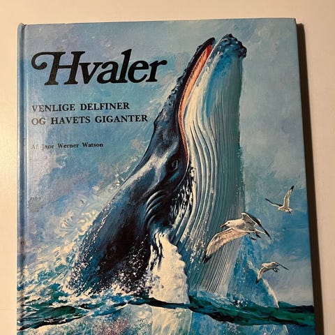 Hvaler, Rejse, “Hvalrejsen” af Vivian French. Billedbog udgivet af Thorup i 1998. “Lille Grå er en gråhval, som bliver født i det varme vand i Stillehavet ud for Mexicos kyst. Sammen med sin mor, Gamle Grå, rejser hun mod nord til Ishavet, som er fyldt med mad. Undervejs bliver de angrebet af spækhuggere. Bogen beskriver i ord og billeder Lille Grås fødsel og gråhvalernes lange rejse, en af de længste rejser et havpattedyr foretager. Følg med og oplev deres eventyrlige verden og farefulde færd mod nord.” Hardback med lidt slid på cover, men derudover i pæn stand!