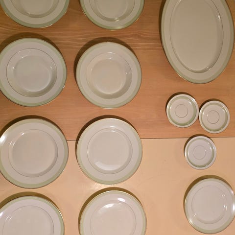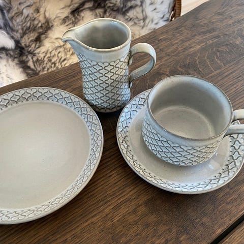 1 kaffekande, 1 flødekande, 2 stk. låg - alle dele uden skår og med pæne guldkanter. Kaffekande 200 kr., flødekande 100 kr., låg 25 kr. pr. stk.