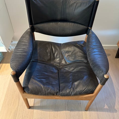 Stolen trænger til en kærlig hånd, dog er net og træ er intakt. Så det drejer sig bare om nyt læder.