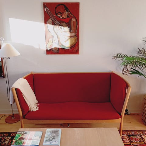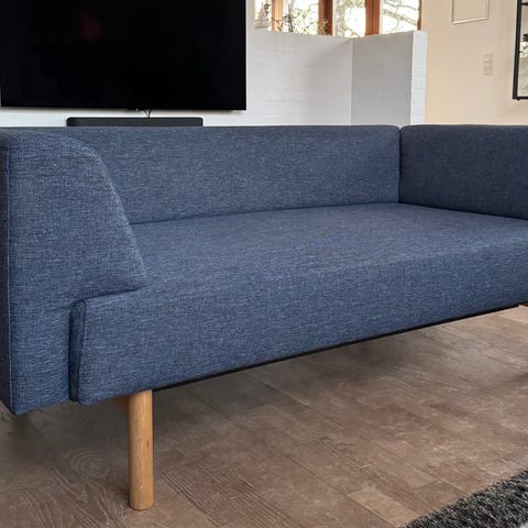 Sofasættet er blevet nylakeret og har fået nye dækkener over fjedrene.