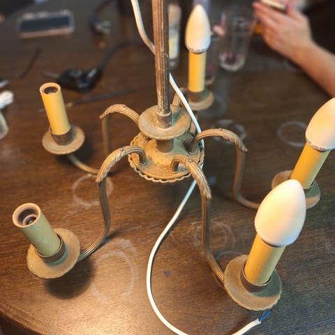Klassisk malmlysekrone med 8 arme. Fremstår uden brugsspor, og alle lyskilder virker.