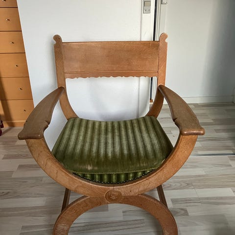 Der er slidmærker på armlænene, og stolen er ombetrukket.