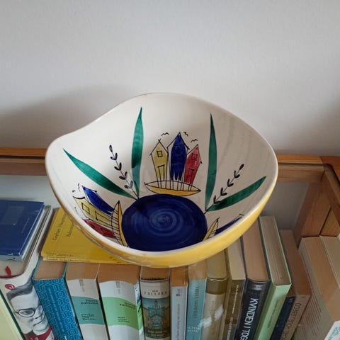 Smukt ildfast skål fra Stavangerflint i Viola stel. Designet med fine blå violer af Rolf Fröyland.