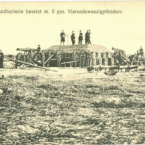 Efter stormen på Dybbøl Banke den 18. april 1864 tog fotografen Christian Friedrich Brandt en serie fotografier af kamppladsen - blandt andet dette foto fra skanse IV fra dagen efter. Ét af de kendteste fotos af de sønderskudte danske kanoner. Postkortet er ubrugt og i perfekt stand.