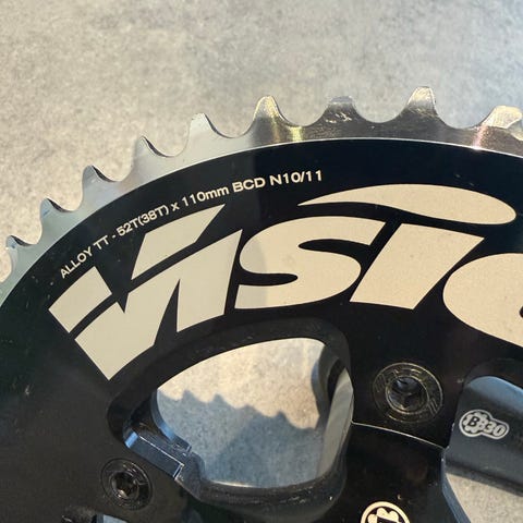 Super lækkert carbon kranksæt . Akslen er 24 mm bred og 103 mm lang, så passer i forskellige krankbokse. Armlængde 175 mm. Note: Bøsningen i driveside er en smule løs (video kan fremsendes, som viser dette). Jeg ved ikke om bøsningen kan fastgøres på et carbon værksted? Klingerne er fine og non-drive armen er også i fin stand. Et topklasse kranksæt, der sælges billigt - der kan bruges som reservedele, as-is, eller muligvis en fastgørelse af bøsningen, så er man kørende i topklassen. Bud modtages !