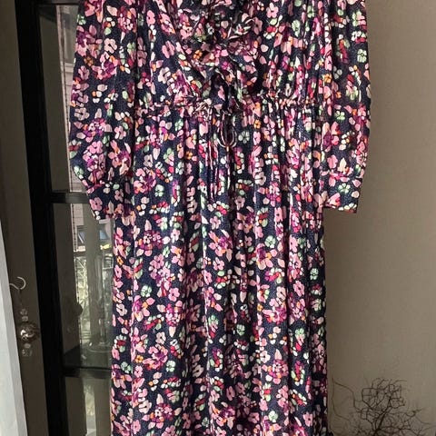 Rigtig fin lyserød kjole i tyl og med sorte prikker og et lag inderstof, så den ikke er gennemsigtig. Lang lynlås bagpå. Bæltestropper i siderne.