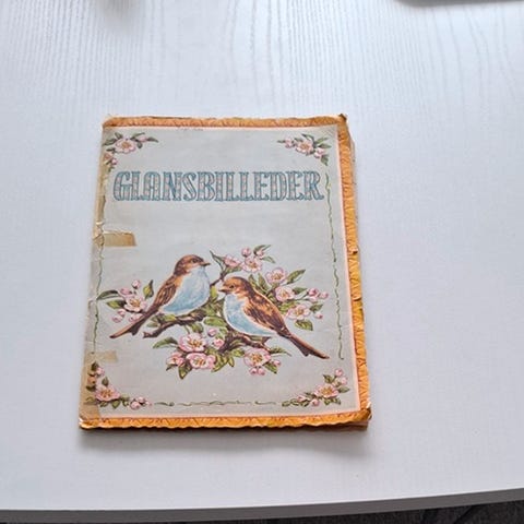 Hæfte med vintage glansbilleder fra 1950erne.. Indeholder en samling af farverige klistermærker med forskellige motiver. Ideel til samlere eller som et nostalgisk element i en kreativ samling. Fra røgfrit hjem. Kan også afhentes i Helsingør efter aftale.