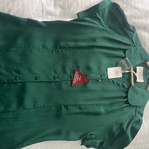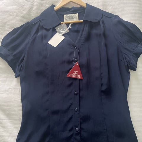 Bluse, Seamstress of Bloomsbury, str. 38, Bluse i vintage stil. Peter Pan krave med blåt bånd. Bindebånd i taljen. Perlemors lignende knapper foran. Fremstillet af rayon crepe-de-chine.