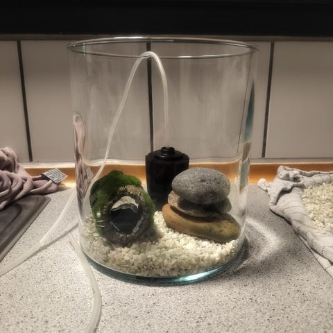 Vel indkørt akvarie med en enkelt amano reje og en Helena snegl. Sælges med spand, slamsuger, rejefoder, net osv.