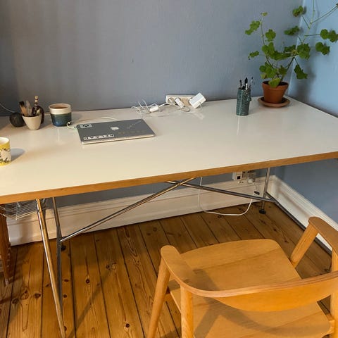 Egon Eiermann designede dette skrivebord tilbage i 1953 til sit eget skrivebord. Der skulle dog ikke gå lang tid før hans elever brugte bordene i det lille klasseværelse. På den måde fik de nemlig plads til flere elever. Stellets tværgående stænger er diagonale med et centreret kryds, så det er muligt at sidde på begge sider af bordet.