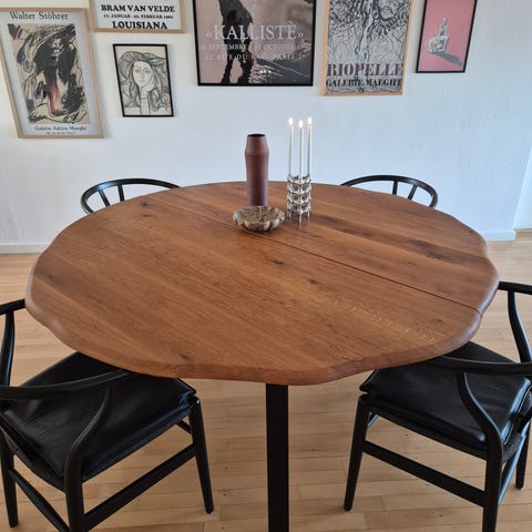 Flot spisebord i massivt olieret egetræ. Bordet har udtræk til 2 tillægsplader. Ekskl. tillægsplader.