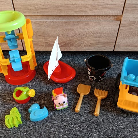 Billede 2: 2 sæt med lille spand skovl, rive 2 sandforme og si. Pr sæt 10kr