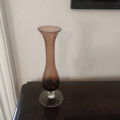 Meget smuk lilla håndlavet høj vase i frostet glas på fod.