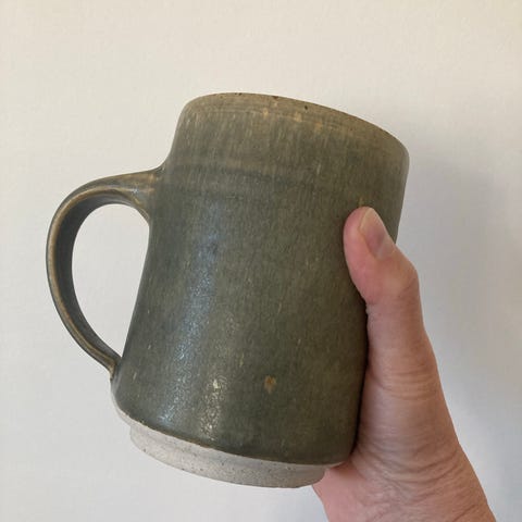 Keramik krus i glaseret stentøj. Lys brun bund og grønt stribet mønster med navne tag: Børge og Jette