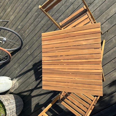 Folder stol og fodskammel, ... kan også anvendes som bord med en bakke på.