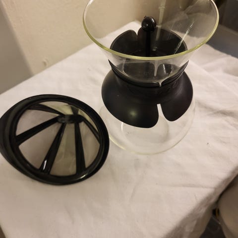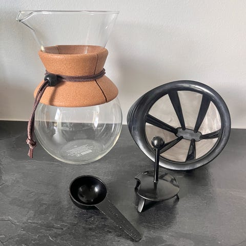Kande af borosilikatglas, der ikke absorberer smag eller aroma, og som derfor også kan anvendes til andet end kaffebrygning. Med låg i rødt plast og halskrave i rød silikone.