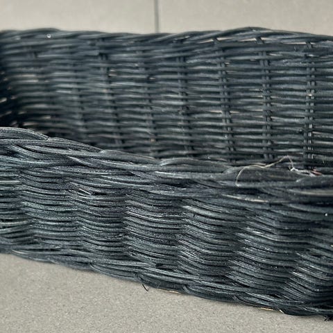 Sød kurv i flet - har aldrig været brugt, så den fremstår som ny. 32 cm i diameter og 32 cm høj inkl hank.