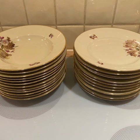 Tallerken fra Gl. Knabstrup “Spillemandsstel”, her dansende par. Der er et lille skår i kanten, men ellers i fin stand.