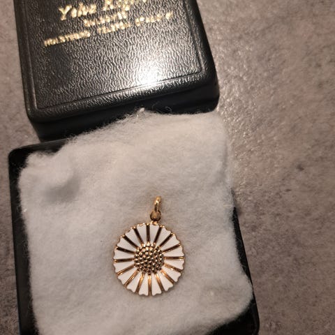 Den klassiske danske Marguerite som vedhæng. Ca 2 cm D. 24 kt guldbelagt sølv med hvis emalje. Uden kæde. Ny. Faktura udskrives. Se flere på www.ptakjewels.dk. Prisen er fast