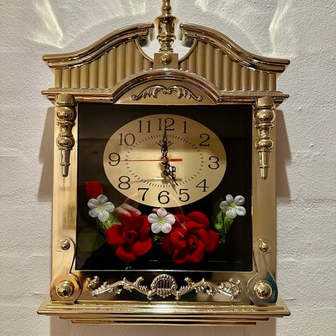 Keramisk vægur med Quartz værk. Ydermål er 22*22cm. Går fint.