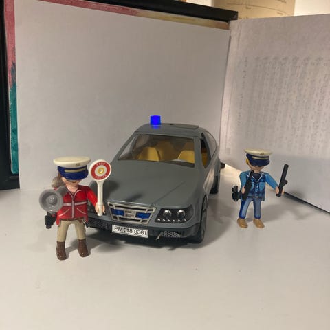 Rigtig fin playmobil politibil, med to politibetjente og en politihund. Begge figurer har pistoler på sig. Sæderne bag i bilen kan også lægges ned.