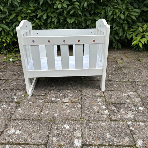 Fin hvid dukkeseng. Den kan sættes op og ned . En lille pude og “dyne”.