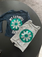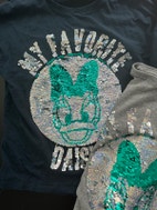 2 langærmede tynde bomuldsbluser fra Name it, str 134. Grå og mørkeblå. Med pailletter som kan vendes - sølv og stærk grøn. Forestiller enten Andersine And eller en blomst. Brugt, men uden pletter eller huller. Pris er for begge bluser.