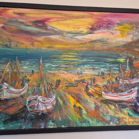 Akrylmaleri, Ubekendt, motiv, b: 80 h: 30, Ss ubekendt kunstner, motiv fra Bornholm, fortolkning af rundkirke, olsker, Nylars, Østerlars , kunst fra Bornholm, bornholmske malerier kim kofod, kunsthandel, i spar kan sendes, 23/10