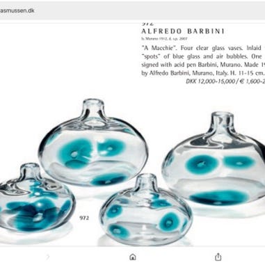 Arvestykker fra mine bedsteforældre. Min farmor købte disse Murano glasvarer på mine bedsteforældres første udlandsrejse til Venedig i starten af 1960'erne. Jeg arvede disse for over 20 år siden, og de har i næsten al den tid stået gemt væk i et skab. Jeg synes, at de fortjener at stå fremme i det rette hjem.