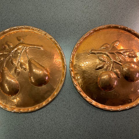 2 Kobber Platter, Disse 2 kobber platter med henholdsvis en vindrue gren med frugt og blade & en kirsebær gren med frugt og blade . De har begge en diameter på 19cm og gætter på at de er fremstillet i England.