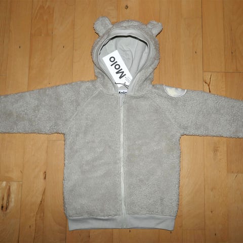 Superfin Molo Teddy fleecejakke (model Ulan) i str. 98. Jakken er i en flot, dyb blå farve og har cool detaljer: en bjørneklo i offwhite på hvert ærme – den ene med stjerner, den anden med teksten “Cub”.